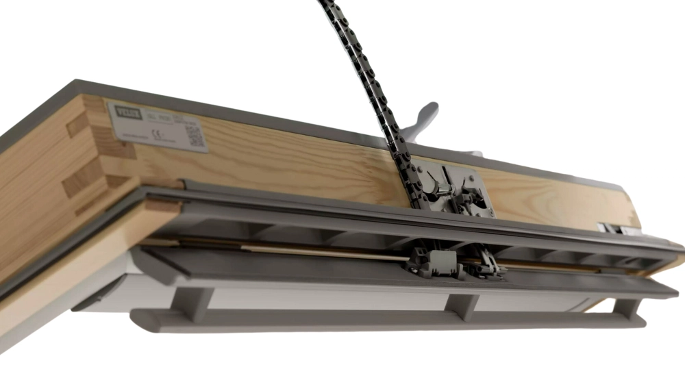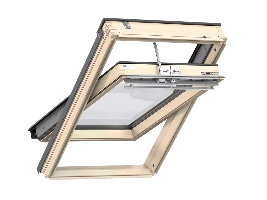 VELUX GLL 106421 - elektrycznie otwierane, drewniane, 3-szybowe okno dachowe. Wyposażone w czujnik deszczu, sterowane radiowo.