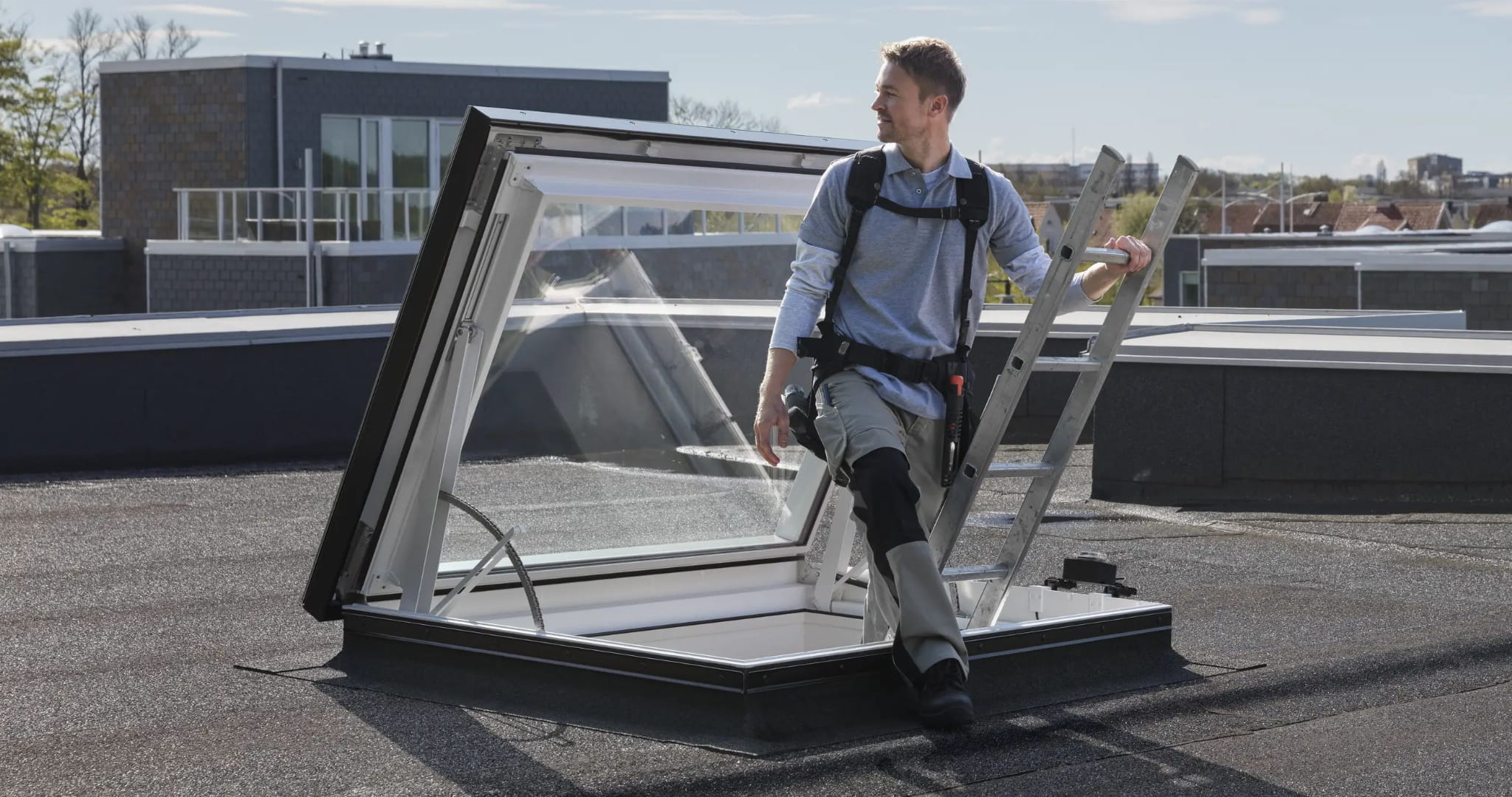 • Dzięki nowoczesnej konstrukcji z przeszkleniem sięgającym krawędzi, wyłaz dachowy wyróżnia się eleganckim wyglądem, spójnym z designem pozostałych okien VELUX do dachów płaskich.