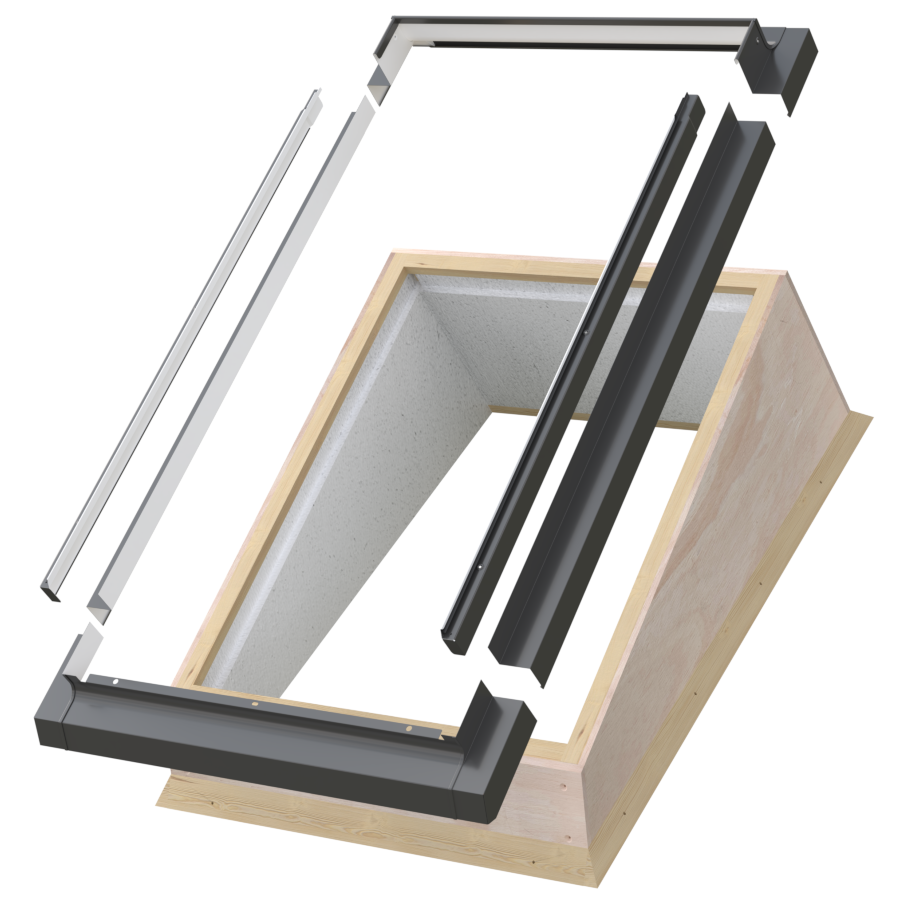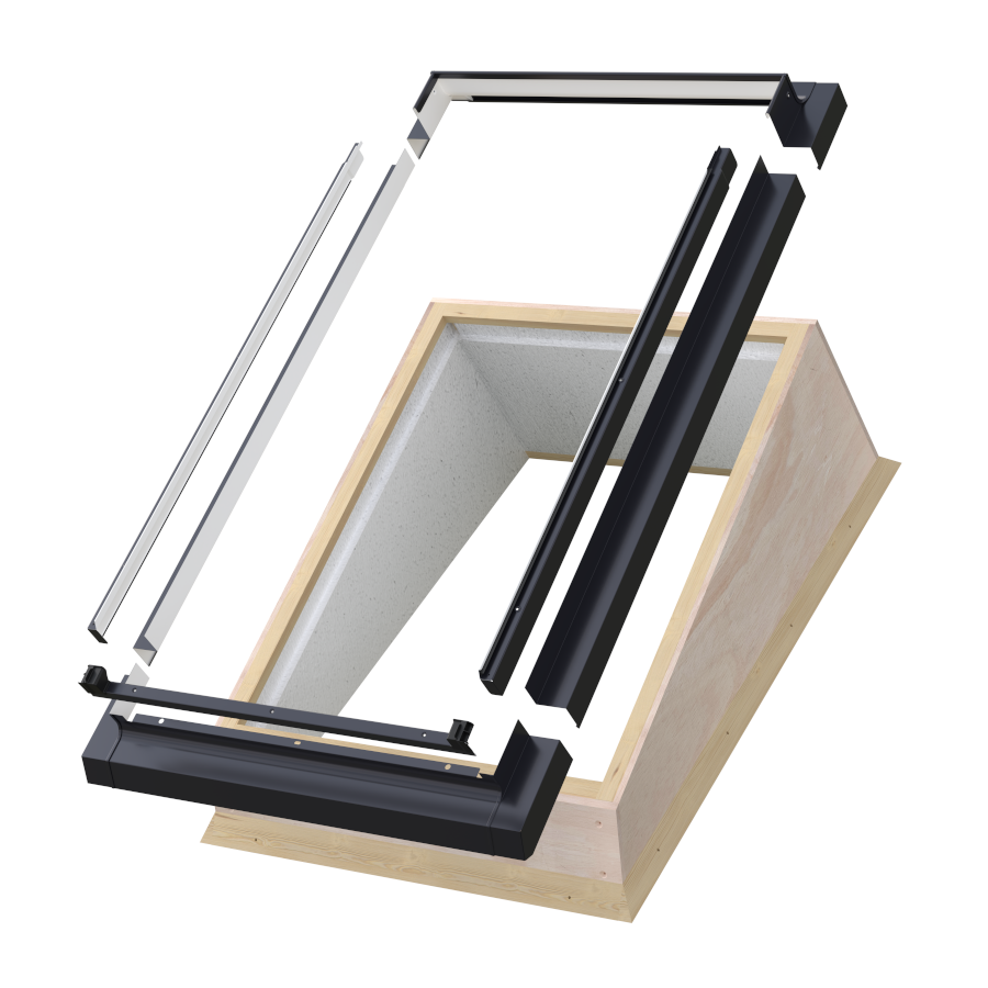 System EFW składa się z dwóch elementów: drewnianej obudowy z przyklejonym materiałem termoizolacyjnym i kołnierzem łączącym montowane okno z obudową. Kątowniki do montażu okna znajdują się w opakowaniu. Drewniana obudowa po zamontowaniu w konstrukcji dachu wymaga wykonania szczelnej izolacji oraz połączenia z istniejącym pokryciem dachowym zgodnie ze sztuką dekarską.
