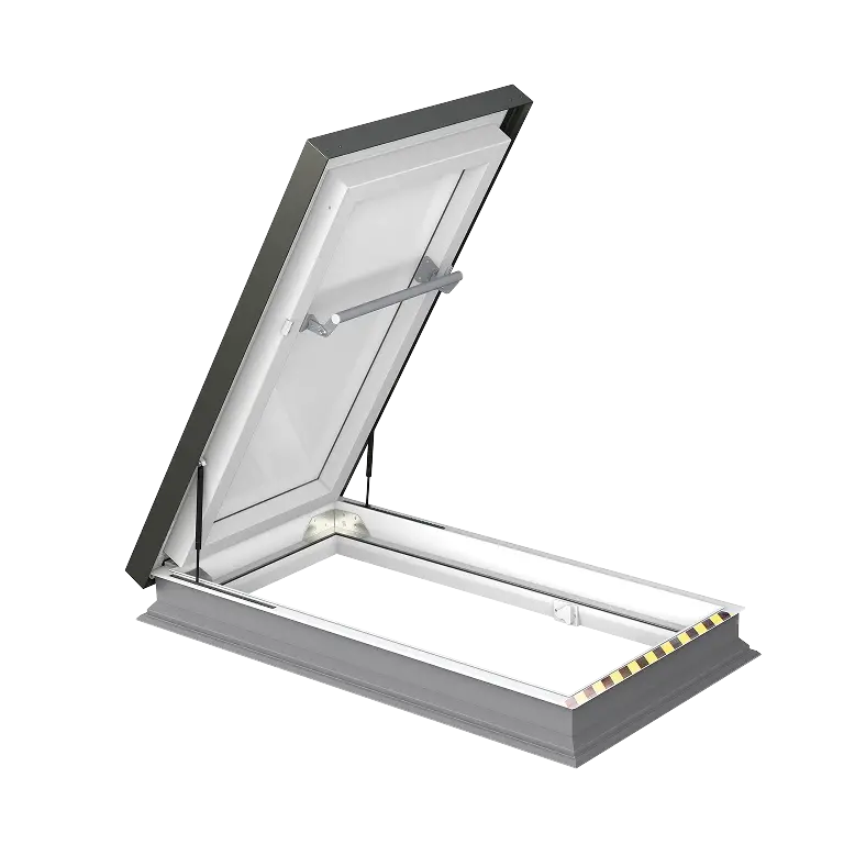 Konstrukcja wyłazu została starannie zaprojektowana – skrzydło otwiera się lekko i zatrzymuje w stabilnej, bezpiecznej pozycji, bez potrzeby używania dużej siły. Zastosowane sprężyny gazowe wspomagają ruch, dzięki czemu obsługa jest płynna i wygodna. Dodatkowo wyłaz wyposażono w taśmę antypoślizgową, która zwiększa bezpieczeństwo, zwłaszcza podczas korzystania w czasie deszczu.